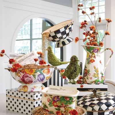 MacKenzie-Childs Hand-painted ceramics dinnerware home decor furniture. Flower Market Emaille-Dose - Weiß 120 bis 133. Only 6 left in stock - order soon.